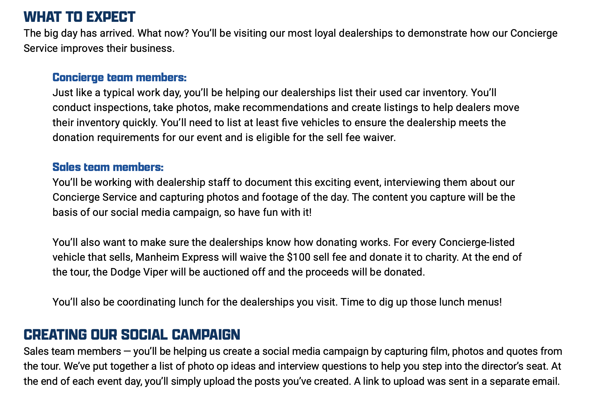 Transporting the Viper from location to location required intricate management for both the dealer network and the Manheim sales team. The sales enablement piece required that every location have a sales team kick-off with an information deck and training guides on how to shoot the video testimonials on their phones. The strategic goal was to make the testimonial footage feel organic. We asked for the sales teams to conduct the testimonials with the dealers in their actual offices to create a genuine environment that did not feel manufactured. We gathered the testimonials, edited the footage, provided the publishing cadence strategy, wrote the social post copy and sent the final product in a fully formed content package that Manheim published on its LinkedIn and Facebook corporate channels.